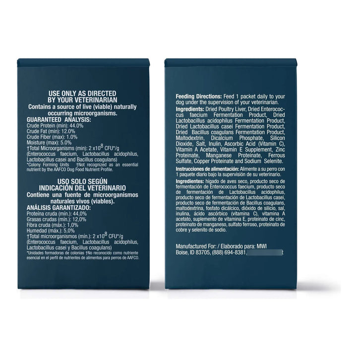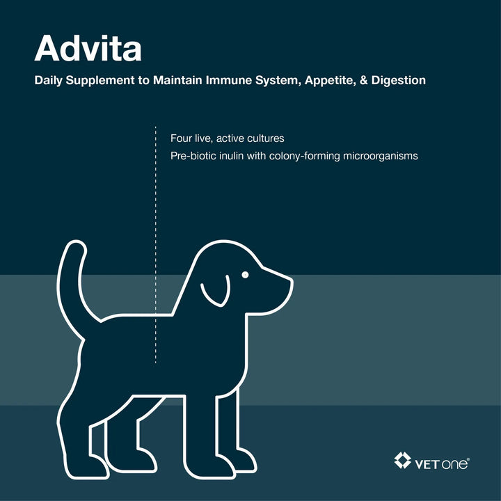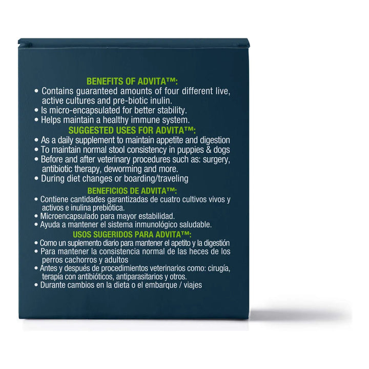Cada paquete de Advita™ contiene una mezcla poderosa de 4 cultivos activos vivos y inulina prebiótica, con más de 200 millones de microorganismos beneficiosos por dosis. Estos ingredientes trabajan en sinergia para restaurar el equilibrio de la flora intestinal, especialmente después de situaciones estresantes como cirugías, tratamientos con antibióticos o cambios de dieta. ¿Tu perro ha estado decaído o con problemas digestivos? Advita™ es la solución que estabas buscando.