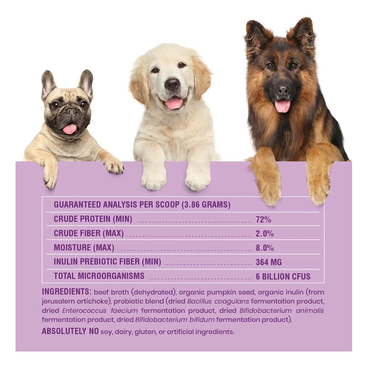 Nuestro polvo probiótico contiene cepas bacterianas beneficiosas que colonizan el intestino de tu perro, promoviendo una digestión óptima y absorción de nutrientes. El caldo de huesos añade colágeno y aminoácidos para fortalecer su sistema inmunológico y articular.