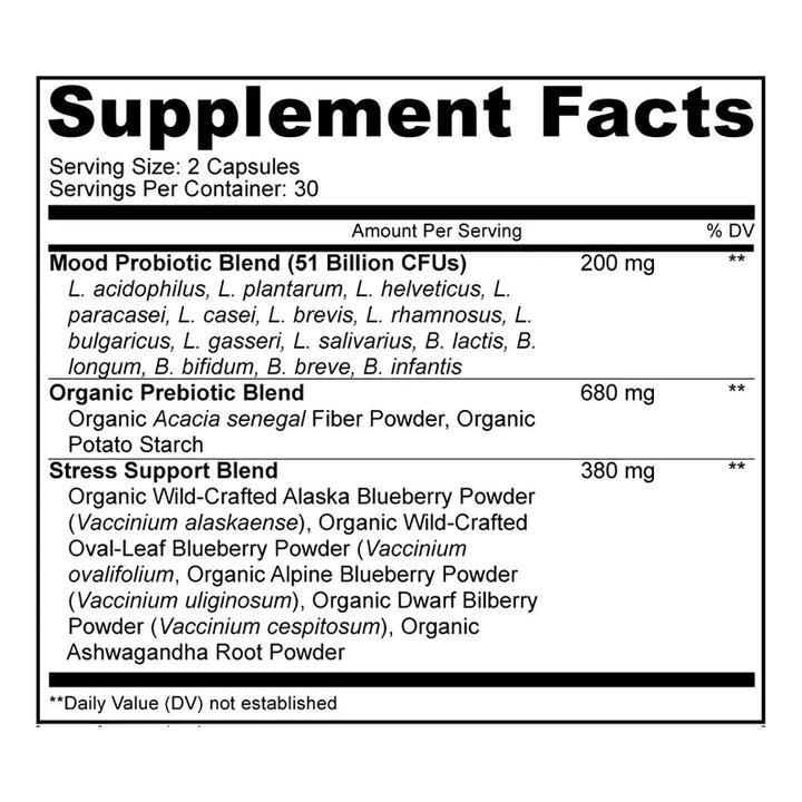 Este probiótico no solo mejora tu salud intestinal, sino que también trabaja en armonía con tu mente. La inclusión de ingredientes como la Ashwagandha orgánica y el polvo de arándano de Alaska silvestre potencia sus efectos, ayudándote a manejar el estrés y a mantener un estado de ánimo equilibrado. Además, al ser vegano, sin gluten y sin lácteos, es perfecto para cualquier estilo de vida.