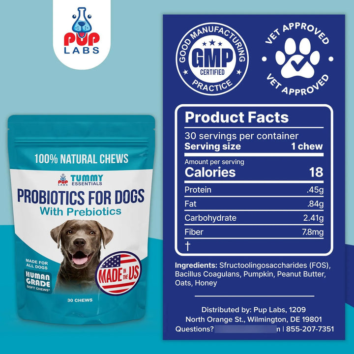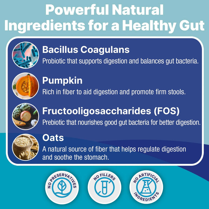 Nuestros probióticos están formulados con ingredientes de alta calidad que sobreviven al ácido estomacal y llegan directamente a los intestinos, donde más se necesitan. No solo alivian los síntomas, sino que también previenen futuros problemas digestivos. Cada masticable está hecho a mano en Florida, horneado a bajas temperaturas para preservar todos sus beneficios. Y lo mejor de todo: ¡a los perros les encanta su sabor!