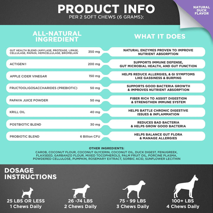 Con una fórmula avanzada que combina 6 mil millones de UFC de probióticos, prebióticos y enzimas digestivas, cada masticable actúa como un escudo protector para el estómago de tu perro. Ingredientes naturales como calabaza, papaya y vinagre de sidra de manzana no solo mejoran la digestión, sino que también hacen que el sabor sea irresistible para tu peludo amigo. No más batallas para darle sus suplementos: ¡ahora los pedirá él mismo!