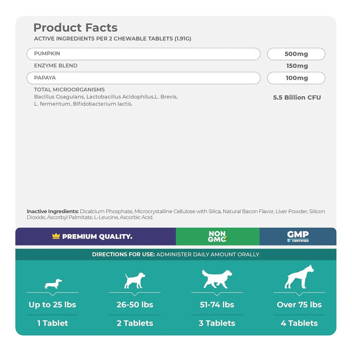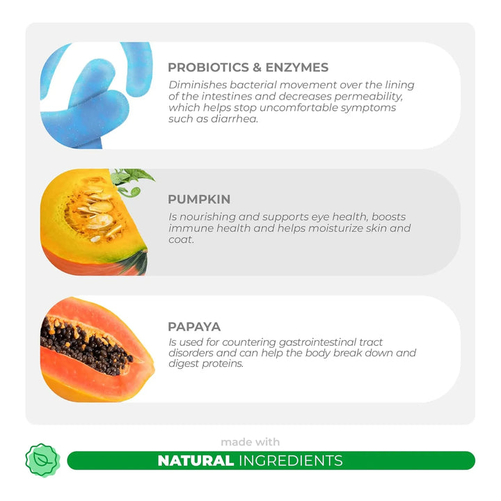 Imagina poder ofrecerle a tu perro un suplemento que no solo mejore su digestión, sino que también refuerce su salud general. Cada tableta está enriquecida con calabaza, papaya y prebióticos, ingredientes clave que trabajan en sinergia para equilibrar su flora intestinal y reducir la permeabilidad de los intestinos. Esto significa menos visitas al veterinario y más momentos de alegría junto a tu compañero peludo.
