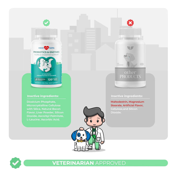 Nuestros probióticos son fabricados en instalaciones certificadas por la FDA, garantizando la máxima calidad y seguridad para tu mascota. Además, son aprobados por veterinarios e hipoalergénicos, lo que los hace aptos incluso para perros con alergias alimentarias. No importa si tu perro es pequeño, grande o de edad avanzada, este producto está diseñado para adaptarse a sus necesidades específicas.