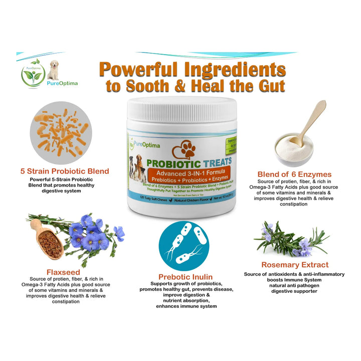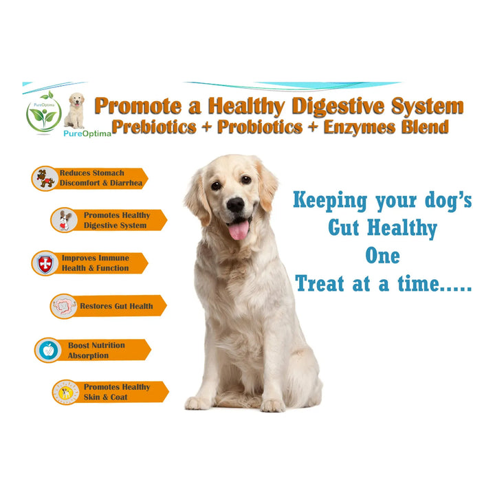 Nuestros probióticos masticables actúan directamente en el tracto digestivo de tu perro. Las 5 cepas probióticas colonizan el intestino, desplazando bacterias dañinas y promoviendo una flora saludable. La inulina prebiótica alimenta estas bacterias buenas, mientras que las 6 enzimas digestivas descomponen los alimentos para una mejor absorción de nutrientes. ¡El resultado? Un perro más activo, con menos molestias y un sistema inmunológico fuerte!