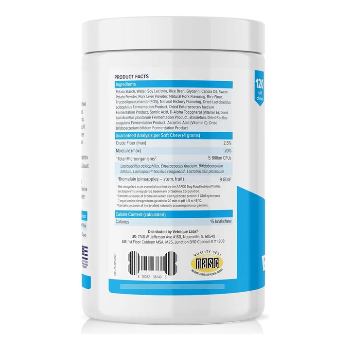 Los Masticables Suaves De Probióticos Para Perros Con Enzimas Di de Vetnique Glandex son la solución que estabas buscando. Con una mezcla única de 5 cepas probióticas, prebióticos y enzimas digestivas, cada mordisco es un paso hacia un intestino equilibrado y una vida más activa para tu compañero. ¡Y lo mejor! Su delicioso sabor a tocino natural los convierte en un premio que tu perro pedirá una y otra vez.