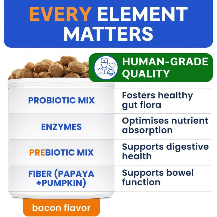 Estas deliciosas golosinas masticables no solo son irresistibles para tu perro, sino que también contienen una poderosa fórmula probiótica y prebiótica de cinco cepas, enzimas digestivas y fibra de calabaza. Cada bocado promueve una flora intestinal saludable, alivia malestares estomacales y fortalece su sistema inmunológico. ¿No sería maravilloso ver a tu peludo disfrutar de cada día sin molestias?