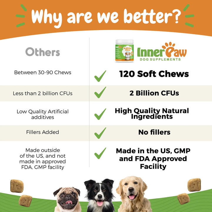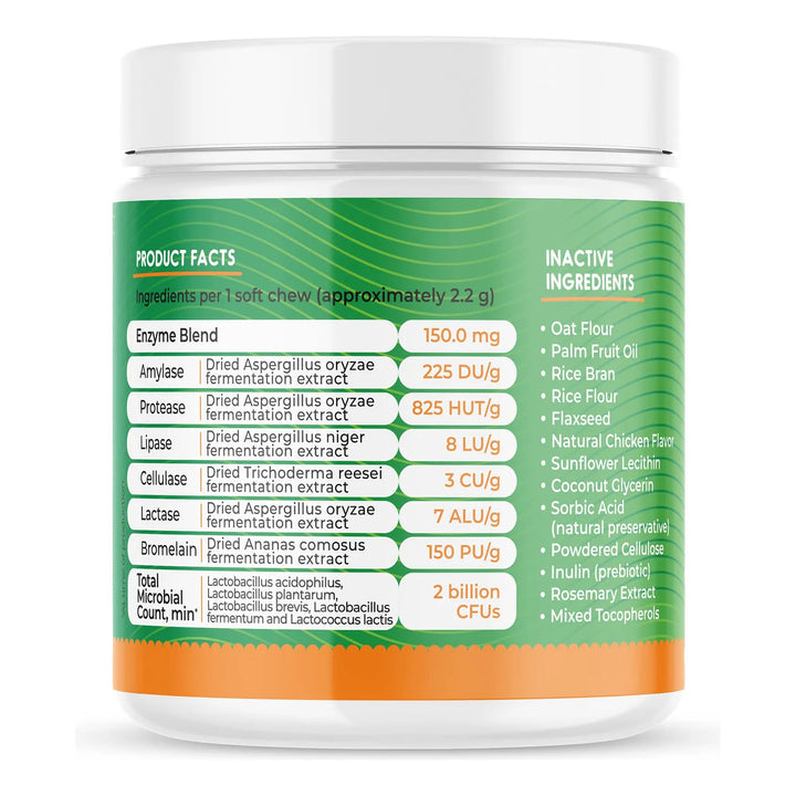 Cada masticable está repleto de 2 mil millones de UFC de probióticos y enzimas digestivas, trabajando en armonía para equilibrar su flora intestinal y reducir síntomas como picazón, piel seca o alergias estacionales. ¡Y a ellos les encantará el delicioso sabor a pollo!