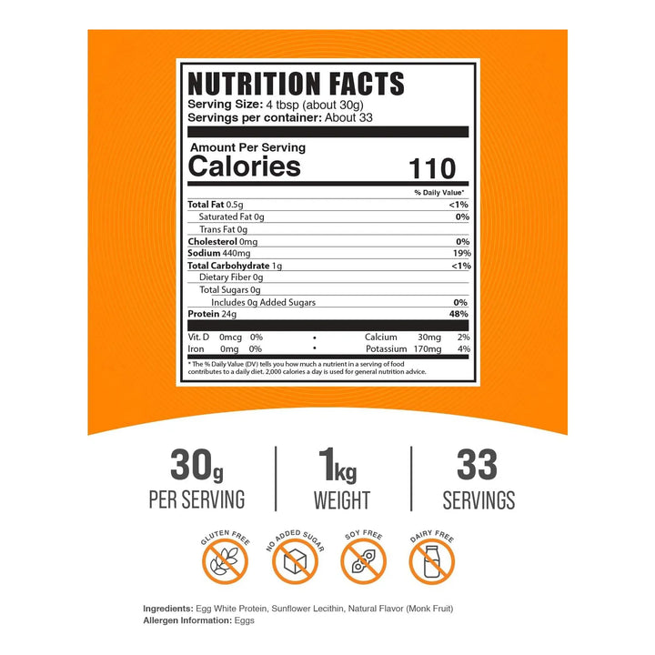 Imagina despertar cada día con la energía y la fuerza necesarias para superar tus límites. Nuestro polvo de proteína de clara de huevo no solo te brinda 1.06 oz de proteína por porción, sino que también está libre de lactosa, sabores artificiales y azúcares añadidos. Perfecto para integrarse en tus batidos favoritos o incluso en tus recetas saludables, sin preocuparte por ingredientes ocultos que sabotearán tu progreso.