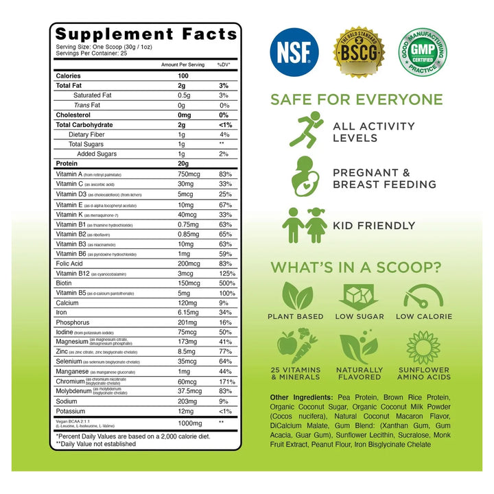 ¿Cansado de batidos de proteína que saben artificial o no se alinean con tu estilo de vida saludable? Descubre la proteína en polvo a base de plantas que no solo nutre tu cuerpo, sino que también deleita tu paladar. Con un sabor irresistible a macarrón de coco endulzado naturalmente con fruta del monje y stevia, cada sorbo es un placer sin culpa. Solo 100 calorías por porción y menos de 0.04 oz de azúcar, perfecto para mantener tus metas fitness sin sacrificar el sabor.