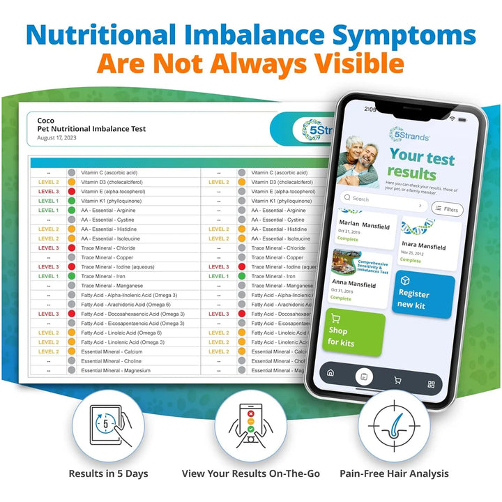 ¿Tu perro o gato sufre de pérdida de cabello, dolor en las articulaciones o piel seca? Estos problemas pueden ser señal de un desequilibrio nutricional. Con la Prueba de Equilibrio Nutricional para Mascotas de 5Strands, podrás identificar las deficiencias de vitaminas y minerales que afectan su bienestar. ¡No dejes que tu mascota sufra en silencio!