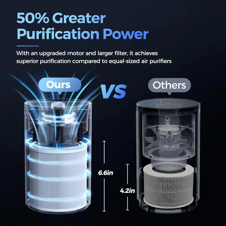 - 50% más eficiente: Área de filtro ampliada y motor robusto para mayor cobertura (880 pies²). 🚀