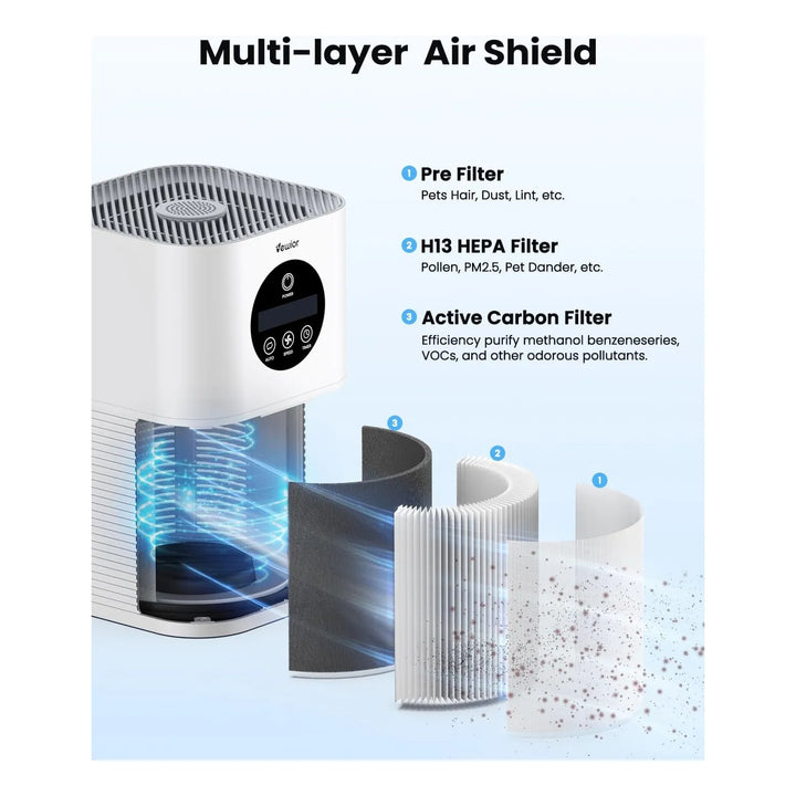 El purificador VEWIOR utiliza un sistema de filtración de 3 etapas para capturar y eliminar contaminantes del aire. Primero, el prefiltro atrapa partículas grandes como pelo de mascotas. Luego, el filtro HEPA H13 retiene partículas microscópicas como polen y bacterias. Finalmente, el filtro de carbón activado neutraliza olores y gases nocivos. El resultado es un aire puro y fresco en todo momento.
