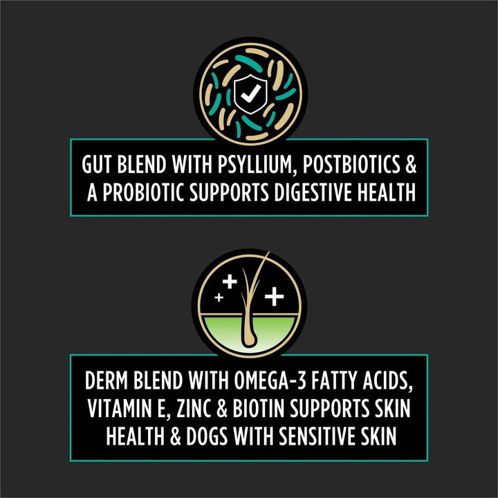 Los ingredientes activos actúan sinérgicamente: los Omega-3 y la biotina nutren la piel y el pelaje, mientras los probióticos y el psyllium equilibran la flora intestinal. Los antioxidantes combaten los radicales libres, protegiendo las células. Así, cada día tu perro estará más fuerte y vital.