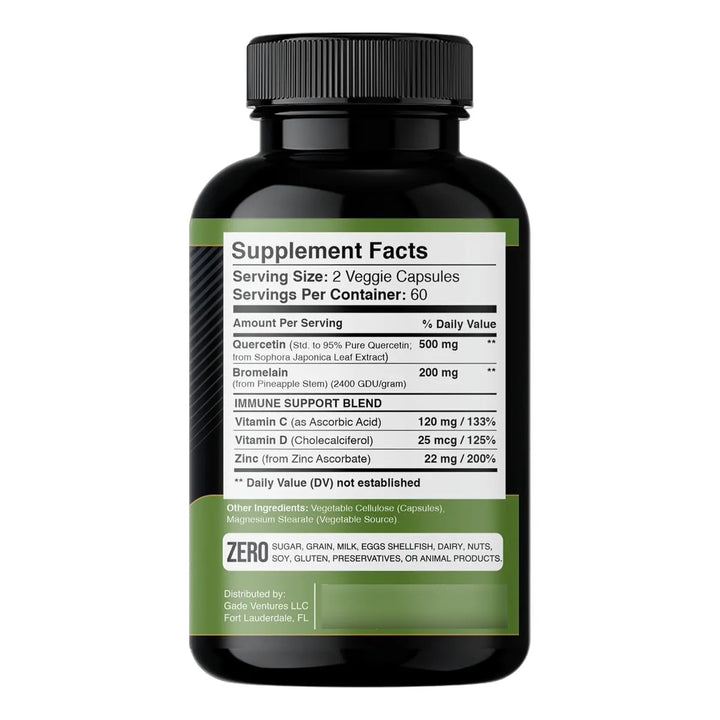 Este poderoso suplemento está diseñado para quienes buscan una solución natural y efectiva. Con ingredientes cuidadosamente seleccionados, como la quercetina, un flavonoide conocido por sus propiedades antioxidantes, y la bromelina, que mejora la absorción de nutrientes, este producto es ideal para apoyar tu bienestar general. ¿Por qué conformarte con menos cuando puedes darle a tu cuerpo lo mejor?