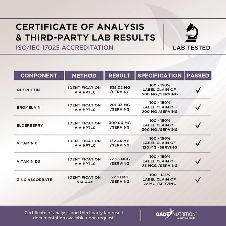 La quercetina actúa como un poderoso flavonoid que inhibe la liberación de histaminas, mientras que la vitamina C y el zinc estimulan la producción de glóbulos blancos. La vitamina D3 regula la función inmunológica, y la bromelina mejora la absorción de los nutrientes. Juntos, crean un efecto sinérgico que: