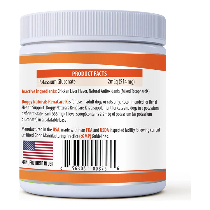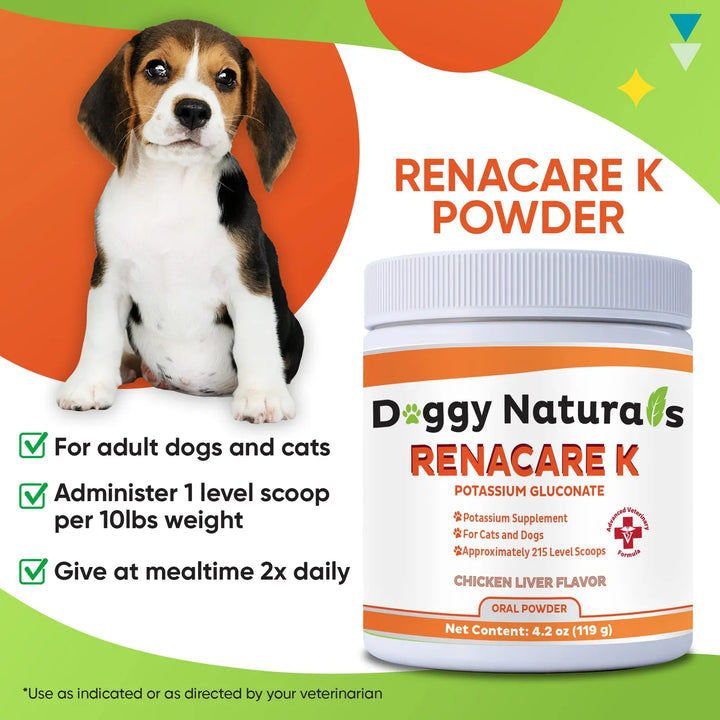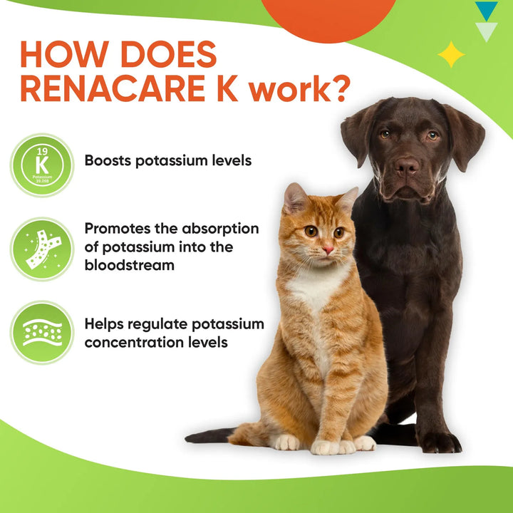 RenaCare K está formulado con gluconato de potasio, un compuesto que se absorbe rápidamente en el torrente sanguíneo para equilibrar los niveles de potasio en mascotas con deficiencias. Al mezclarse con la comida, el polvo libera sus nutrientes, apoyando la función renal y manteniendo a tu mascota activa y saludable.