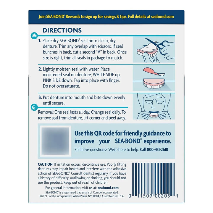Los sellos Sea-Bond crean una barrera adhesiva entre tu dentadura y las encías, utilizando un material seguro que se activa con la humedad natural de tu boca. Su fórmula se adapta a la temperatura corporal, liberando suavemente el adhesivo para mantener la posición correcta de tu prótesis sin molestias.