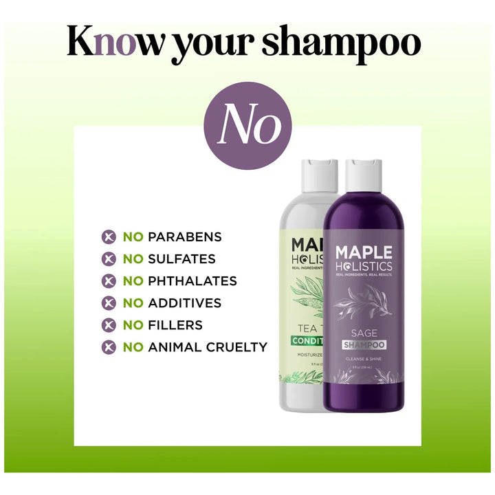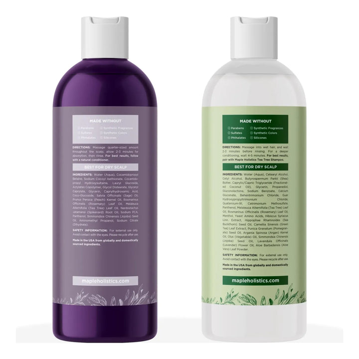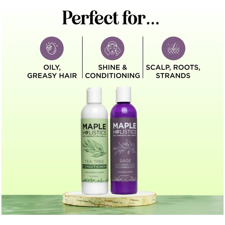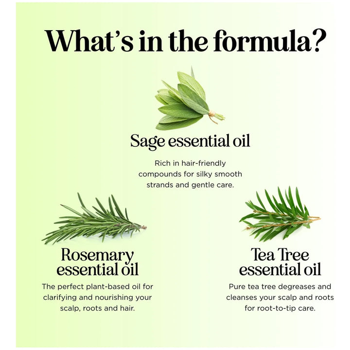 El champú elimina impurezas y acumulación de células muertas gracias al aceite de árbol de té, mientras que la salvia equilibra la producción de grasa. El acondicionador sella la cutícula del cabello, sellando la hidratación y previniendo roturas. Juntos, restauran el equilibrio natural de tu cuero cabelludo.