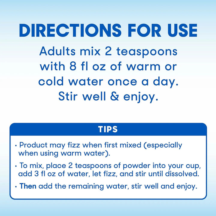 - Agrega una cucharadita (incluida) a 8 oz de agua fría o tibia.