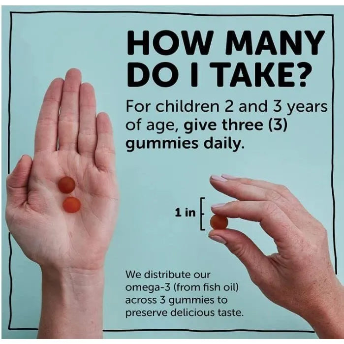 - Niños de 2 a 3 años: Tomar 3 gomitas al día bajo supervisión adulta.