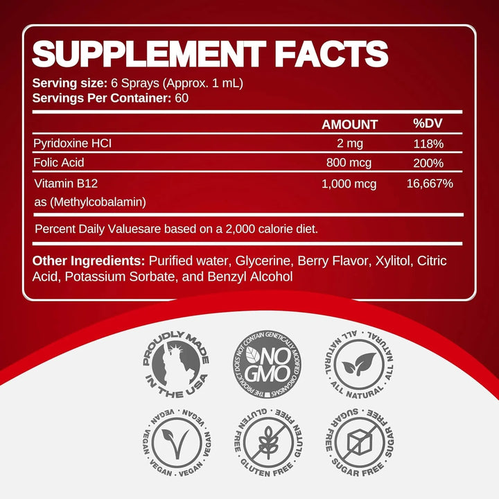 Nuestro spray utiliza tecnología sublingual avanzada que permite que los nutrientes se absorban directamente en el torrente sanguíneo, evitando el sistema digestivo donde gran parte de la vitamina se pierde. Además, está enriquecido con ácido fólico y piridoxina HCl para maximizar sus beneficios. Es vegano, libre de gluten y fabricado en un laboratorio certificado GMP en los Estados Unidos, garantizando la más alta calidad y pureza.