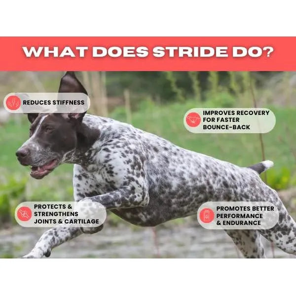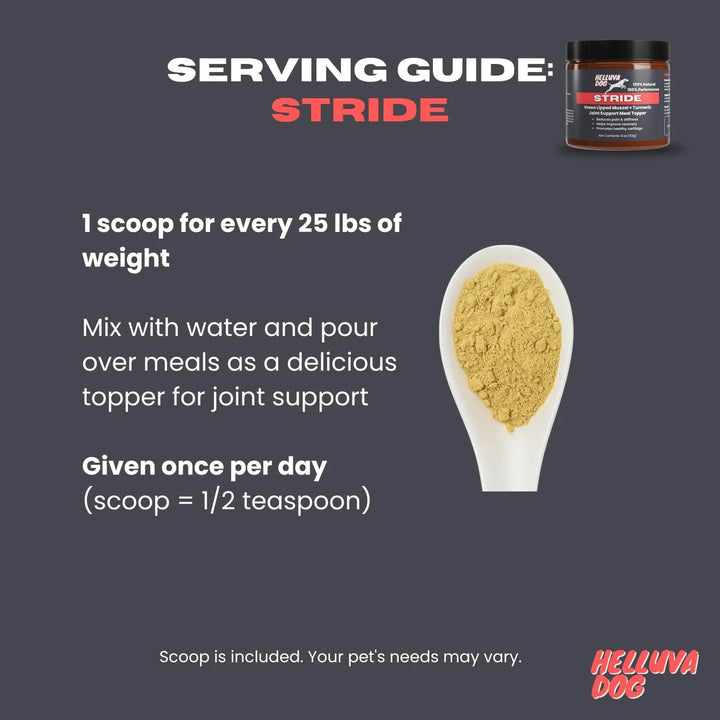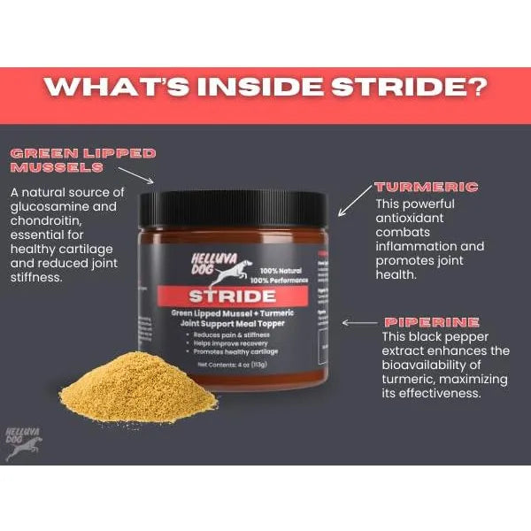 El Cubrecomida Articular Stride by Helluva Dog combina los beneficios del mejillón de labios verdes, rico en ácidos grasos omega-3 y glucosamina, con la cúrcuma, un potente antiinflamatorio natural. Juntos, estos ingredientes trabajan para: