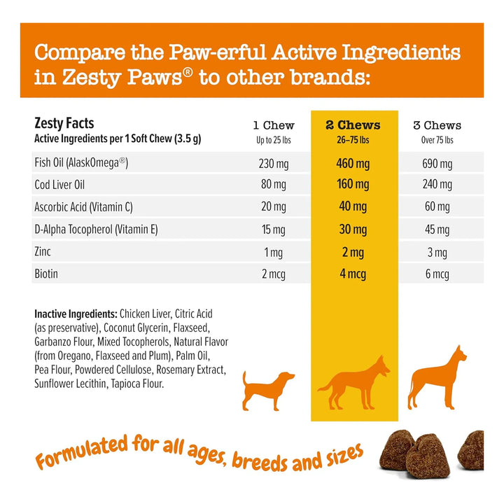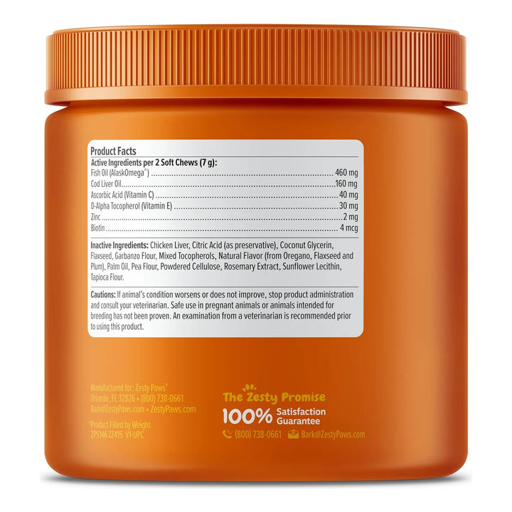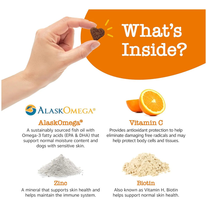 Los ácidos grasos Omega-3 (EPA y DHA) del aceite de pescado reducen la inflamación y mejoran la hidratación de la piel, mientras que la biotina y el zinc fortalecen el pelaje. Las vitaminas C y E protegen contra el daño celular, brindando un alivio duradero.
