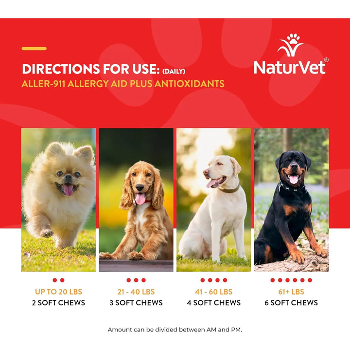 ¿Tu mascota sufre de alergias estacionales, picazón o problemas respiratorios? No dejes que las alergias roben la alegría de tu mejor amigo. Con el Suplemento Antialérgico Antioxidante NaturVet Aller-911, tu perro o gato recibirá el apoyo que necesita para combatir los contaminantes ambientales y fortalecer su sistema inmunológico. Formulado por veterinarios y enriquecido con omegas, DHA, EPA y antioxidantes, este suplemento no solo alivia los síntomas, sino que también promueve una piel saludable y una respiración óptima.