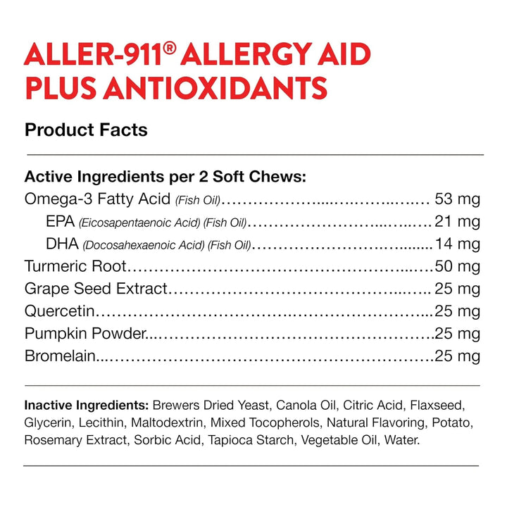 El NaturVet Aller-911 combina una mezcla poderosa de antioxidantes, ácidos grasos esenciales y vitaminas que trabajan en sinergia para reducir la respuesta alérgica. Los omegas 3, DHA y EPA disminuyen la inflamación, mientras que los antioxidantes neutralizan los radicales libres que afectan la salud de tu mascota. Con el uso continuo, notarás menos rascado, menos estornudos y una mascota más activa y feliz.