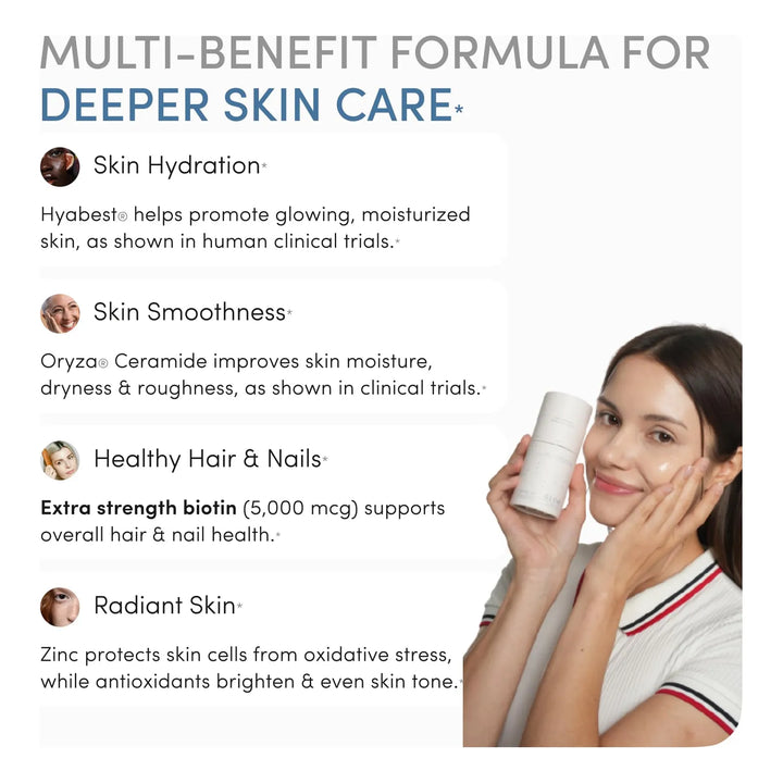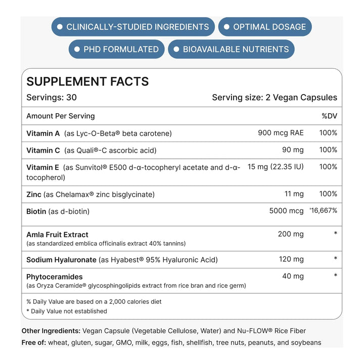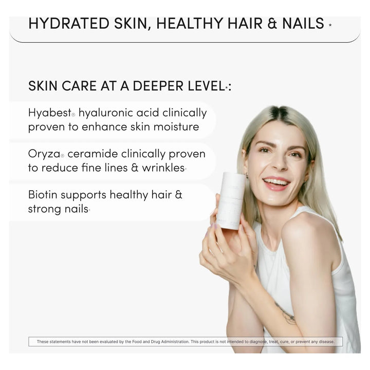El suplemento actúa desde el interior para regenerar tu piel, cabello y uñas. El ácido hialurónico y las ceramidas restauran la barrera natural de la piel, reteniendo humedad y reduciendo líneas finas. La biotina estimula la producción de queratina, fortaleciendo estructuras capilares y ungueales. Los antioxidantes neutralizan radicales libres, previniendo el daño celular.