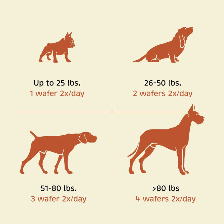 - Determina el peso de tu perro (1-25 lb: 1 oblea 2x/día; 26-50 lb: 2 obleas 2x/día; 51-80 lb: 3 obleas 2x/día; +80 lb: 4 obleas 2x/día).