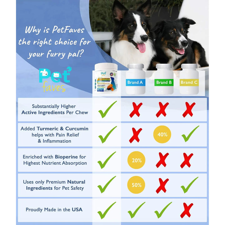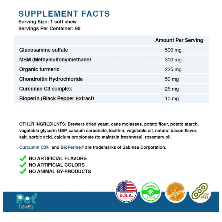 Imagina ver a tu compañero canino recuperar esa energía que tanto extrañas. Con nuestros masticables deliciosos, no solo estarás aliviando su dolor, sino también protegiendo sus articulaciones a largo plazo. La combinación única de curcumina, glucosamina, condroitina y MSM actúa como un escudo para sus huesos y cartílagos, mientras la Bioperina asegura una absorción rápida y efectiva.
