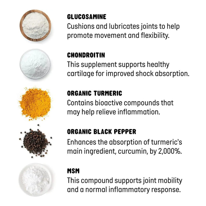 Los ingredientes activos trabajan en sinergia: la glucosamina y condroitina reparan el cartílago dañado, mientras que la cúrcuma y MSM reducen la inflamación y el dolor. La vitamina E y C fortalecen el sistema inmunológico y óseo. ¡Resultados visibles en semanas!