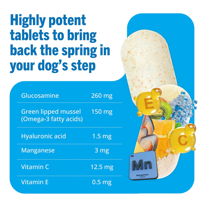 La glucosamina y condroitina trabajan juntas para reparar y proteger el cartílago dañado, mientras que el mejillón de labios verdes reduce la inflamación. El ácido hialurónico lubrica las articulaciones, y las vitaminas C y E fortalecen el sistema inmunológico. ¡Es como un equipo de superhéroes para las articulaciones de tu perro!