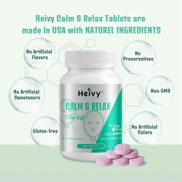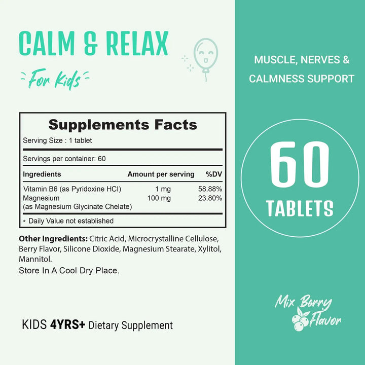 Diseñado pensando en la seguridad y el bienestar de los más pequeños, cada tableta combina nutrientes esenciales que apoyan el sistema nervioso y la relajación. Con un delicioso sabor a bayas y un formato fácil de tragar, incluso los niños más exigentes lo aceptarán sin problemas. No contiene ingredientes artificiales, colorantes ni alérgenos comunes, lo que lo hace seguro para estómagos sensibles. Fabricado en los EE.UU. bajo estrictos estándares de calidad, puedes confiar en que estás dando lo mejor a tu hijo.