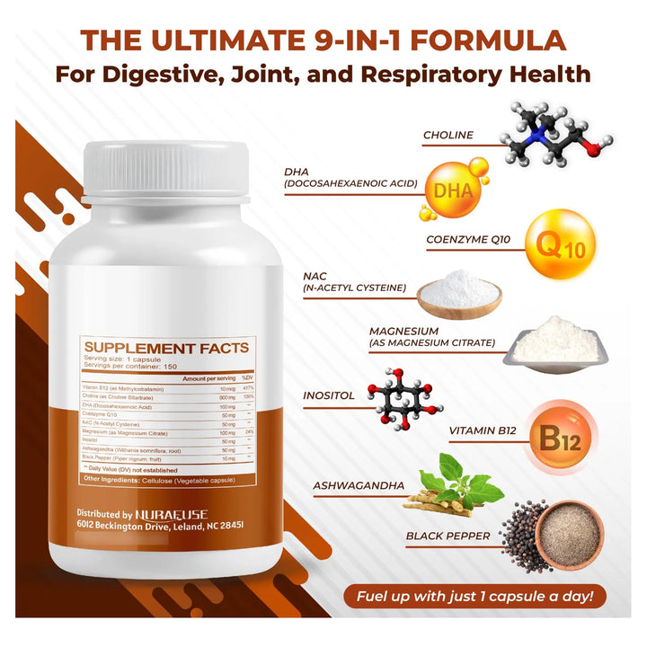 Nuestro suplemento de Colina con DHA, Inositol, Vitamina B12, Coenzima Q10, NAC, Magnesio y Ashwagandha está diseñado para quienes buscan una solución real. No es solo otra vitamina más; es un enfoque integral respaldado por ciencia. Cada cápsula contiene ingredientes meticulosamente seleccionados para trabajar en sinergia, apoyando desde tu función cognitiva hasta la salud celular.