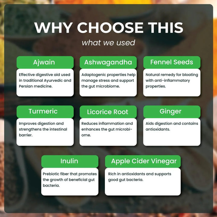Nuestra fórmula única combina ingredientes ancestrales como la ashwagandha, semillas de carom y cúrcuma con tecnología moderna de probióticos (2 mil millones de UFC) para restaurar tu microbioma. No es solo un suplemento más: es un aliado diario que trabaja en múltiples frentes para aliviar la hinchazón, reducir la inflamación y promover una digestión suave.