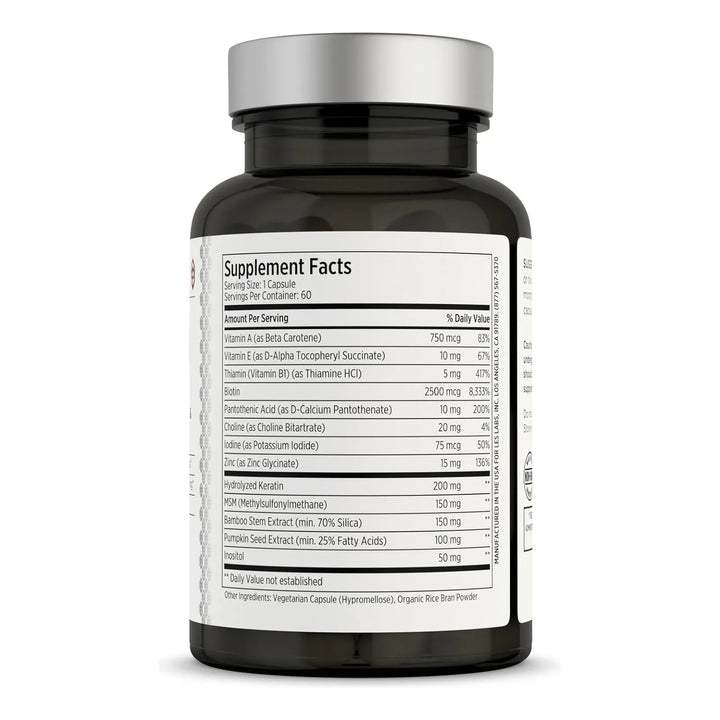 Este suplemento actúa directamente en la raíz del problema. La biotina y la queratina estimulan la producción de proteínas capilares, mientras el MSM aporta azufre, esencial para la síntesis de colágeno. El extracto de bambú, rico en silicio, mejora la elasticidad y previene la rotura. Juntos, estos ingredientes crean un ambiente ideal para que tu cabello y uñas crezcan sanos y fuertes.