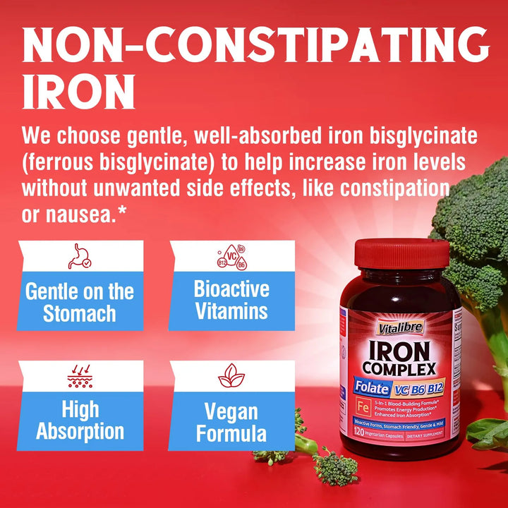 Suplemento de Hierro con Vitaminas C, B6, B12 y Folato – 120 Cápsulas Veganas
