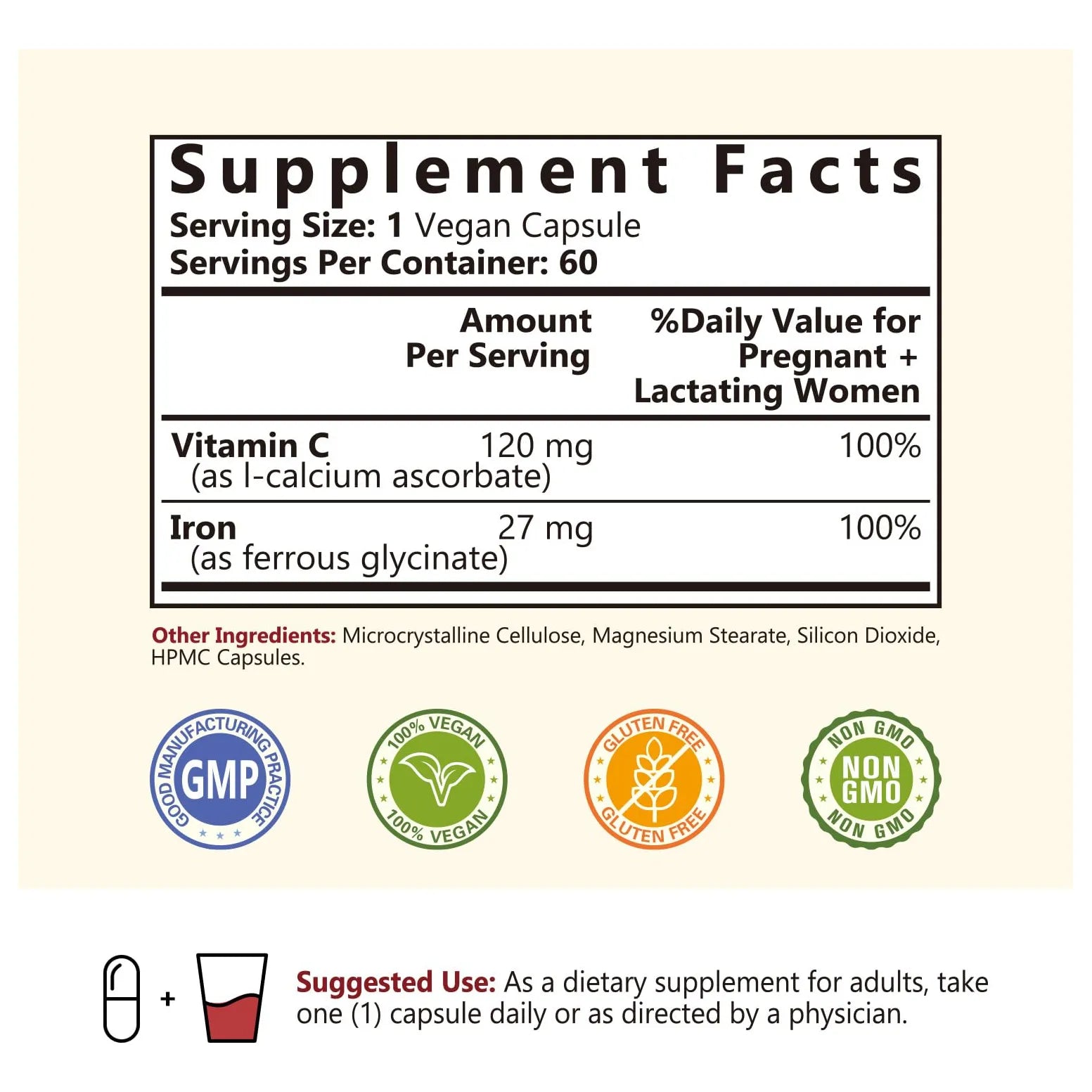 Suplemento De Hierro Suave 27 Mg Bisglicinato Con Vitamina C Absorcion Optima