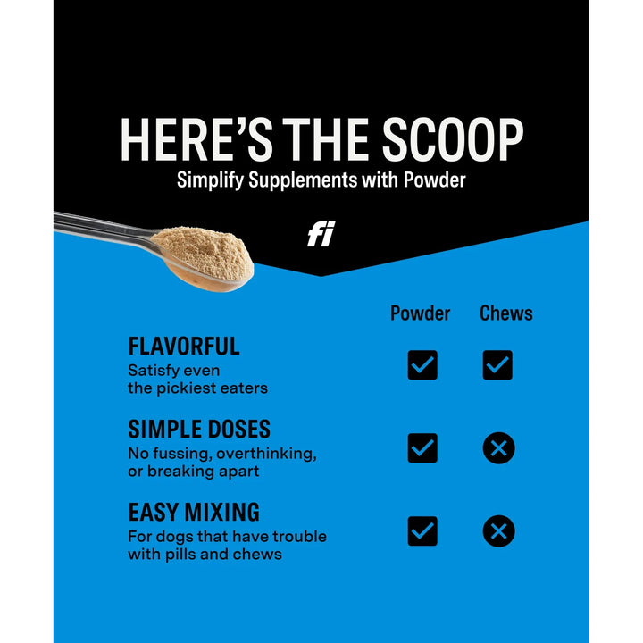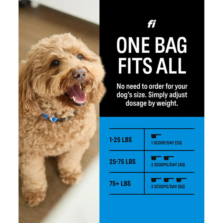- Mide la dosis según el peso de tu perro (1 cucharada para perros hasta 25 lbs, 2 para 25-75 lbs, 3 para más de 75 lbs).