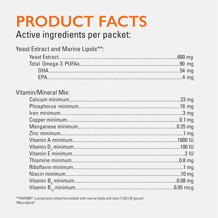 Este suplemento en polvo, formulado con ingredientes premium como beta-glucanos, ácidos grasos omega-3 (EPA y DHA), y una mezcla de vitaminas y minerales, está diseñado para perros de todas las edades. Ayuda a combatir el estrés físico y emocional, común en situaciones como envejecimiento, visitas al veterinario o cambios de entorno.