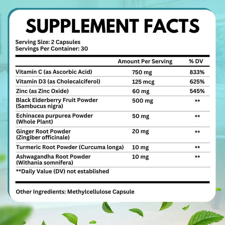 El saúco actúa como un escudo natural, bloqueando la replicación viral, mientras la vitamina C y el zinc optimizan la producción de glóbulos blancos. La vitamina D3 regula la respuesta inmunológica, y la equinácea reduce la duración de los síntomas. La cúrcuma y el jengibre combaten la inflamación, y la ashwagandha ayuda a manejar el estrés, un factor clave en la inmunidad.
