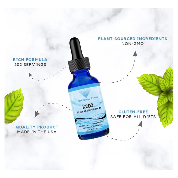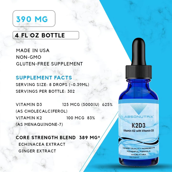 ¿Te preocupa no obtener suficientes nutrientes de tu dieta? K2D3 combina vitamina K2, vitamina D3, extracto de equinácea y jengibre en una fórmula poderosa que tu cuerpo absorbe fácilmente. Sin gluten, sin OMG y fabricado en Estados Unidos en instalaciones certificadas GMP, este producto es la elección inteligente para quienes buscan calidad y confiabilidad.