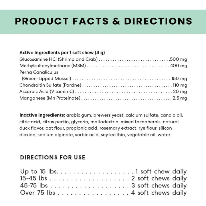 Imagina ver a tu perro jugar como cuando era cachorro, sin dolor ni rigidez. Con 500 mg de glucosamina y 110 mg de sulfato de condroitina por masticable, este producto ayuda a regenerar el cartílago y mejorar la movilidad. Además, el mejillón de labios verdes GlycOmega y el MSM trabajan juntos para reducir la inflamación y promover articulaciones saludables.