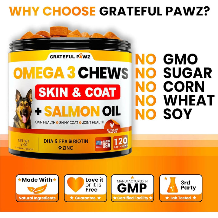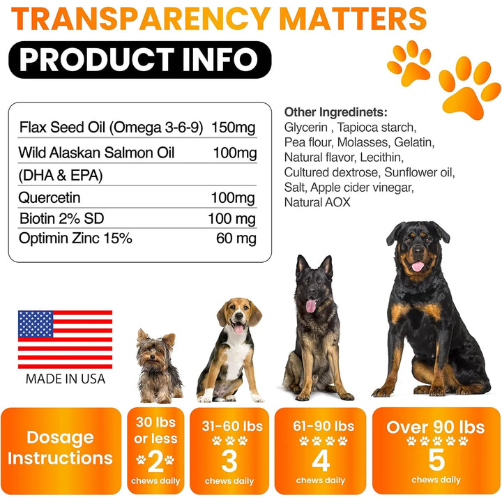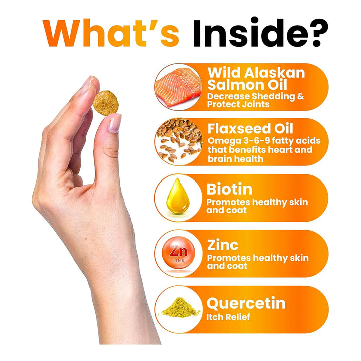 Cada masticable está repleto de aceite de salmón de Alaska y semilla de lino, ricos en Omega 3, 6 y 9, además de DHA, EPA, biotina y zinc. Estos nutrientes trabajan juntos para fortalecer su sistema inmunológico, reducir la inflamación y promover una piel y pelaje saludables. No más preocupaciones por alergias, enrojecimiento o pérdida excesiva de pelo. ¡Dale a tu perro el cuidado que se merece!