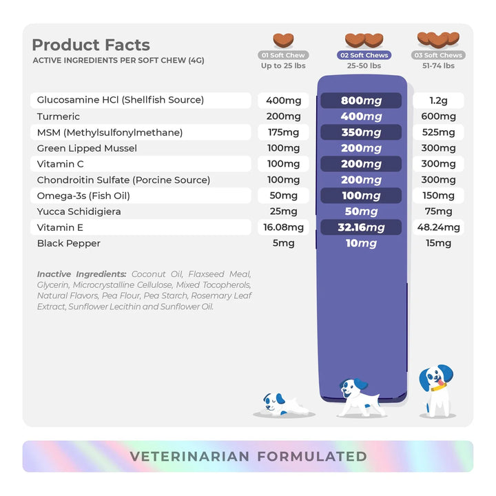 Los ingredientes activos actúan en tres fases: primero alivian la inflamación aguda (MSM y cúrcuma), luego reparan el tejido dañado (glucosamina + condroitina) y finalmente protegen contra el desgaste futuro (omega-3 y antioxidantes). Para mejores resultados, divide la dosis diaria en dos tomas (mañana y noche) según el peso de tu mascota.