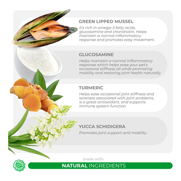 Nuestra fórmula exclusiva combina glucosamina, condroitina y mejillón de labios verdes, tres poderosos aliados para la salud articular. Estos ingredientes trabajan en sinergia para reducir la inflamación, reparar el cartílago dañado y lubricar las articulaciones, mientras que la cúrcuma y la yuca schidigera aportan antioxidantes para combatir el estrés oxidativo.