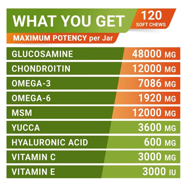 Imagina ver a tu mascota saltando de felicidad otra vez, disfrutando de sus paseos favoritos sin molestias. Nuestra fórmula mejorada no solo alivia el dolor, sino que también promueve la salud articular a largo plazo. Cada masticable está repleto de glucosamina, condroitina, MSM y ácido hialurónico, nutrientes esenciales para mantener sus articulaciones fuertes y flexibles. ¡Porque ellos dan todo por ti, es tu turno de cuidarlos!