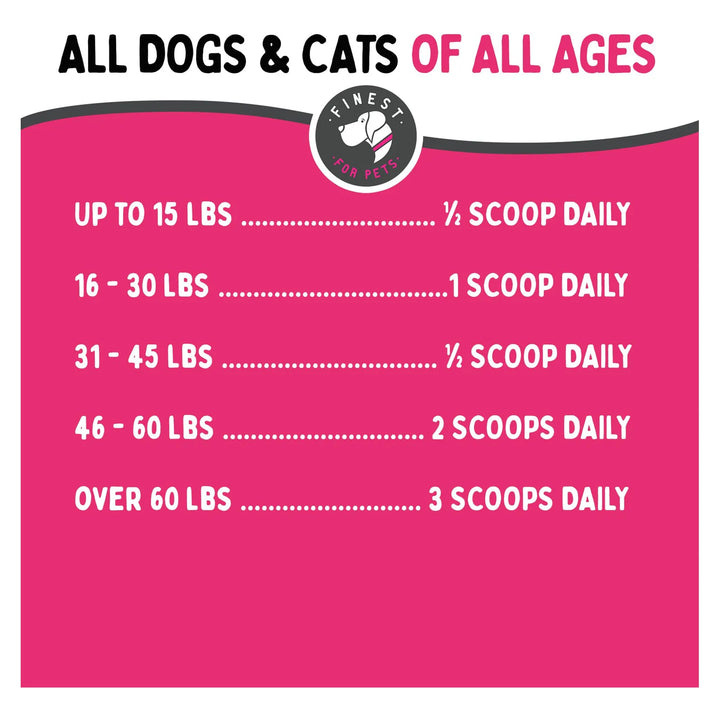 - Agrega 1 cucharada del polvo al alimento húmedo o seco de tu mascota, según su peso (consulta la dosificación exacta en el empaque).